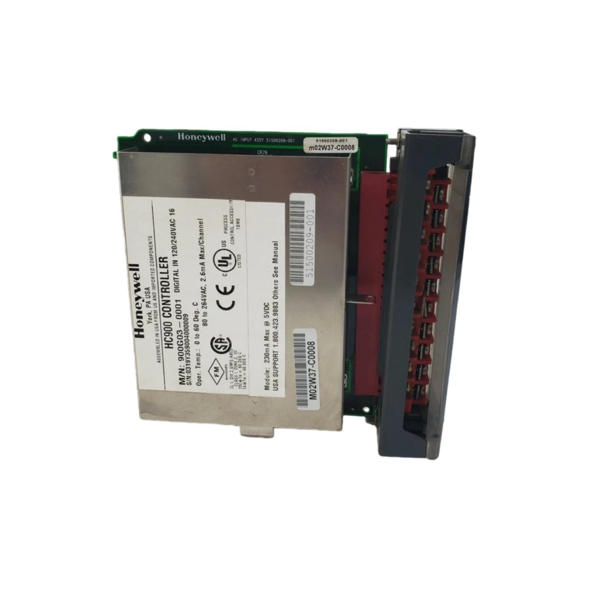 The Honeywell 900G03-0001 is a high-voltage digital input module purpose-built for the Honeywell HC900 process control system. This unit monitors AC-powered equipment status through sixteen isolated input channels. It accepts standard 120 VAC or 240 VAC line voltages directly without external signal conditioners.